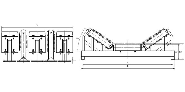 | 型號(hào) | 適用 帶寬 | H1 | H2 | L | A | B | θ | 托輥直徑 | 緩沖條數(shù) | 托輥組數(shù) |